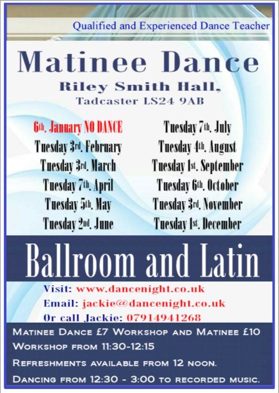 Social dancing with Jackie Hinde of Dance night. Doors open from 12noon and refreshments are on sale. Dancing starts at 12noon for three hours. This Social Dance is strictly Ballroom and Latin. Pay on the door and no need to book. £7 per person